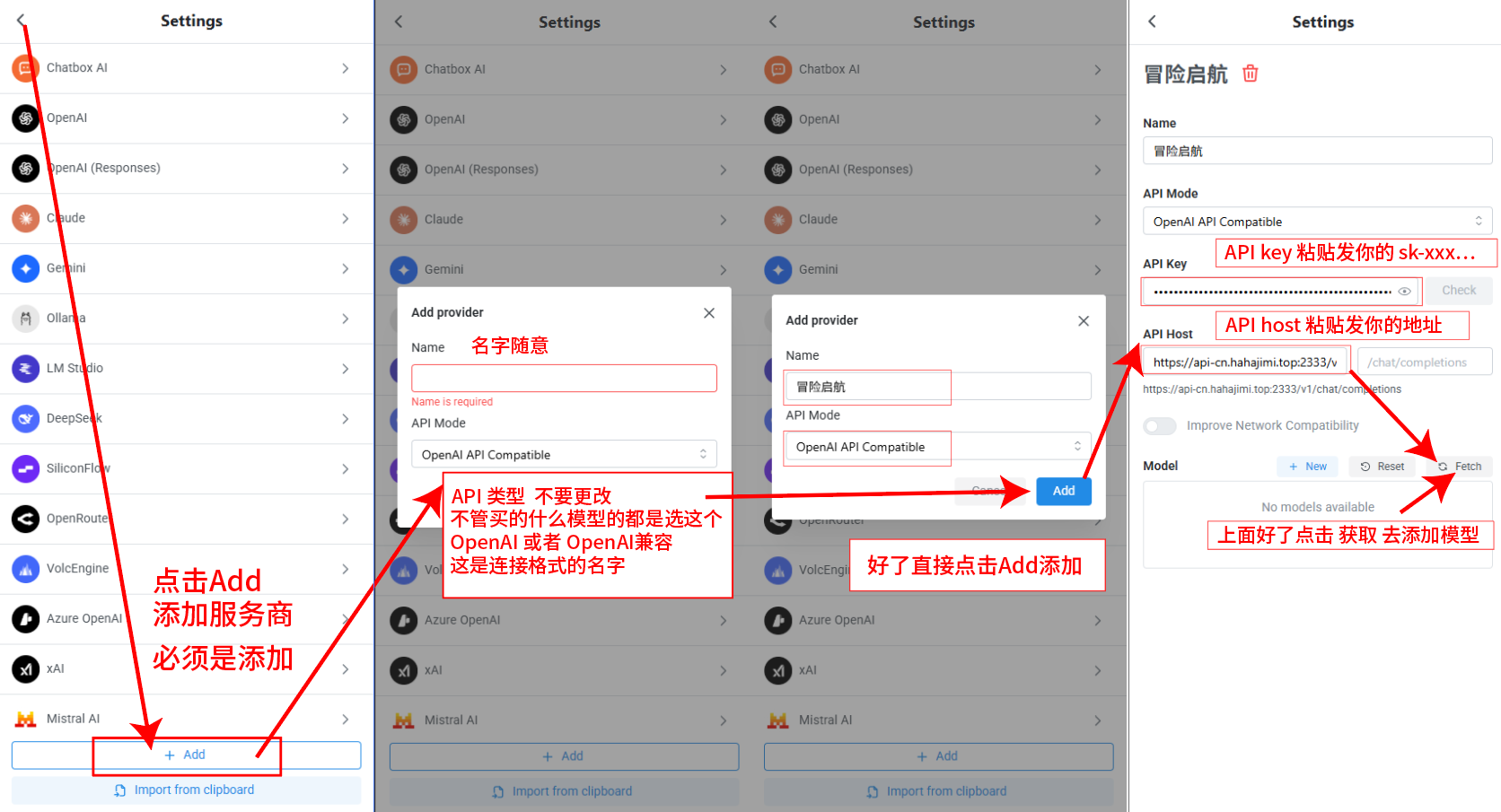 模型提供方:在下拉菜单中选择 “OpenAI”(注意:即使你用的是 Gemini 或 Claude,只要是第三方 API,统一选 OpenAI 协议)。
